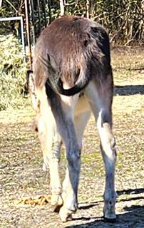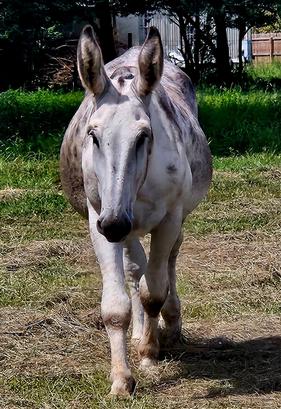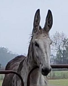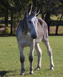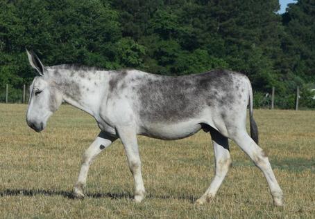 Slate is a regal looking dapple gray intact breeding American Mammoth Jackstock jack born May 14, 2010. He has substance, excellent conformation and an athletic forward moving gait. He is a big strong jack with an exceptionally nice neck set and beautiful long ears. Slate measures 15.2 hands tall. He has a calm loving temperament. He is an easy and accommodating friendly jack to handle. CMJS Slate is sired by CMJS Stevie x Penny. Stevie was a son of PCF's Preacher II. His dam, Penny, was the top producing jenny on our farm. Penny was shown successfully in her youth and has thrown many top-quality foals. Slate carries foundation bloodlines of Preacher, Bully Boy and Jen Jack. Slate is throwing big babies with his bone density, disposition and color. Slate only breeds jennies.