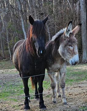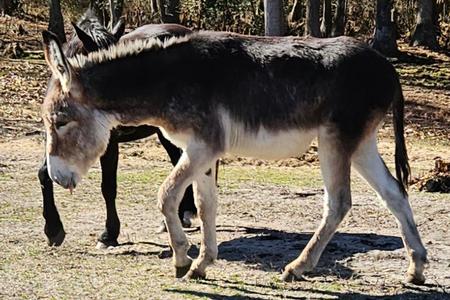 July is a 2016 jenny we rescued. She is a black with white points jenny, standing 15 hands. July is registered with the AMJR. Before we got her, she was trained to pull a wagon. She is not trained to the saddle. She is off of Elliott's Circle E May x Bostick's John Boy. July carries foundation bloodlines of Rancho La Burrada Walter. She has a long stride with forward moving gaits. She is a shy girl until she learns to trust you and then she is in your pocket. She would be a good addition to anyone's breeding or riding program. July was ultrasounded and is bred for a 2025 Fall foal to our, two year old jack, NMJS Barnabus (15.2 HH), a grandson of CMJS Hank (16HH).
