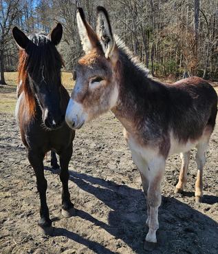 CMJS Atticus is an awesome young jack born September 6, 2021. He is a black with white points American Mammoth Jackstock Jack standing 15.2 hands. He is still growing. Atticus is going to be a big boy with excellent balanced conformation, good bone density and a good head with the long narrow ears we like to see. He has a long stride with forward moving gaits. He has a gentle nature and has been handled since birth. Atticus is off of Tennessee Gal (15.3 HH) x CMJS Hank (16 HH). Atticus carries foundation bloodlines of Thomas’s TexAss, Preacher, Bully Boy, and Jen Jack. Atticus has been raised to breed Mares. He would be an outstanding addition to anyone’s breeding program. Its hard to find this kind of top quality Mammoth Jack.