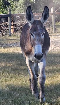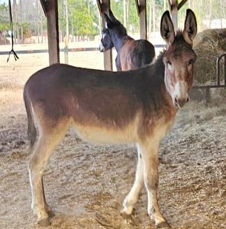 CMJS Windy Lu was born March 23, 2024. She is a black with white points American Mammoth Jackstock Jenny standing 13 hands tall. Windy Lu is still growing and has excellent balanced conformation, good bone density and a good head with the long narrow ears we like to see. She has a long stride with forward moving gaits. Windy Lu has been handled since birth and leads. Windy Lu is off of LuLu Arkansas (15 HH) x CMJS Jacob (16.2 HH). Windy Lu carries foundation bloodlines of Preacher, Nonami and Rancho La Burrada Walter, to name a few. Darla is registered with the AMJR Registry. She would be an outstanding future addition to anyone’s breeding or riding program when reaching maturity.